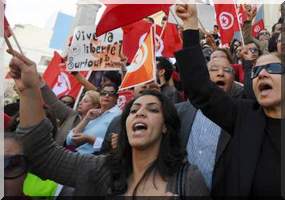 Plusieurs milliers de manifestants, parmi lesquels une majorité de femmes et de jeunes filles, qui enveloppés du drapeau tunisien rouge et blanc, qui hissant l'étendard national, ont déferlé dès les premières heures de la matinée sur l'avenue Bourguiba, principale artère de la capitale, dans une ambiance festive, a constaté un journaliste de l'Associated Press.