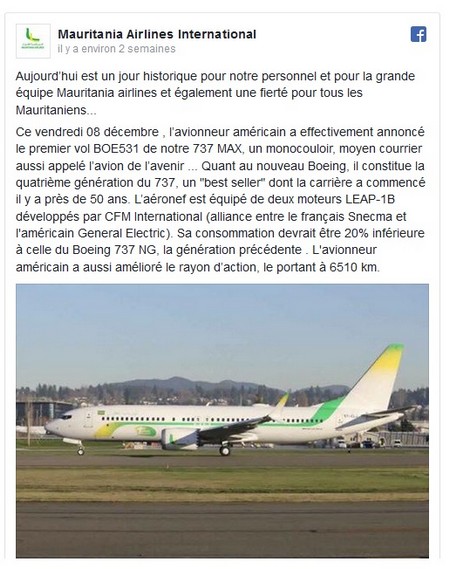 Outre Mauritania Airlines, les clients africains du 737 MAX comprennent Arik Air (Nigeria), Comair (Afrique du Sud) et Ethiopian Airlines (Ethiopie).